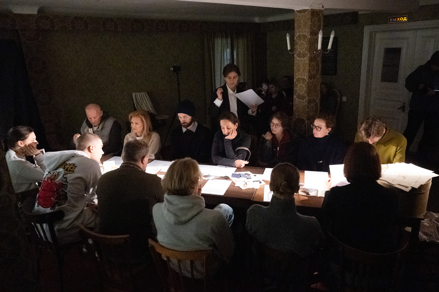 «Процесс создания был витиеватым, потому что у нас не было какого-то готового образца, мы пытались найти точную форму. Обстоятельства создания спектакля были очень непростые. Мы начали с изучения огромного количества материалов: документов, писем, эскизов, фотографий, критических статей, воспоминаний. Книга „Николай Ставрогин на сцене Московского художественного театра“ Ольги Егошиной была одним из важнейших источников, который помог нам ближе познакомиться со спектаклем „изнутри“. Главными информационными источниками нашего проекта стали цифровые копии объектов из музея МХАТ. Наша цель состояла в том, чтобы проект не превратился в выставку. Так мы и пришли к идее спектакля-инсталляции».